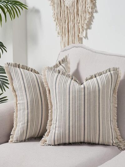 1pc Striped Pattern Tassel Decor Cushion Cover Without Filler, Boho Tassel Trim Design Decorative Cushion Cover For Bed, Sofa