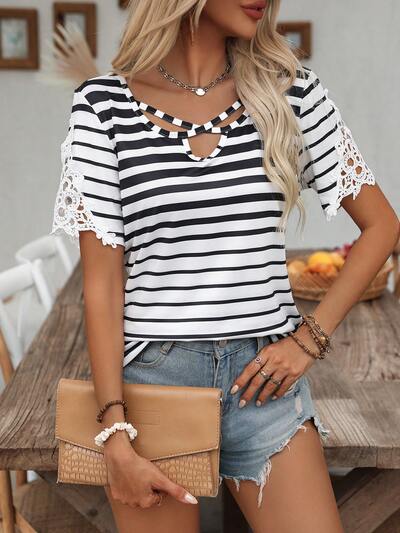 Women's Fashionable Elegant Striped Printed Contrast Lace Short Sleeve Casual T-Shirt-33%