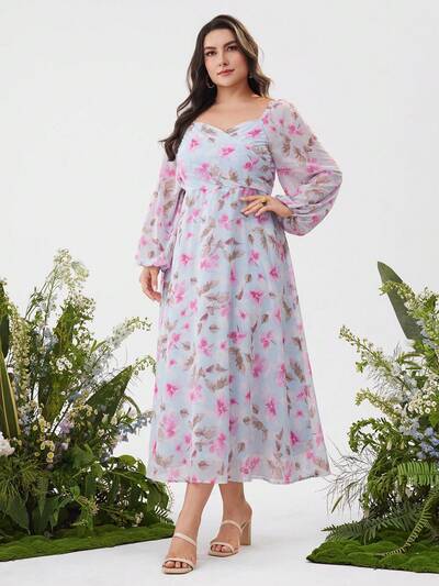 Plus Size Summer Elegant Tie-Dye Floral Printed Puff Sleeve Waist Cinched Waist Dress
