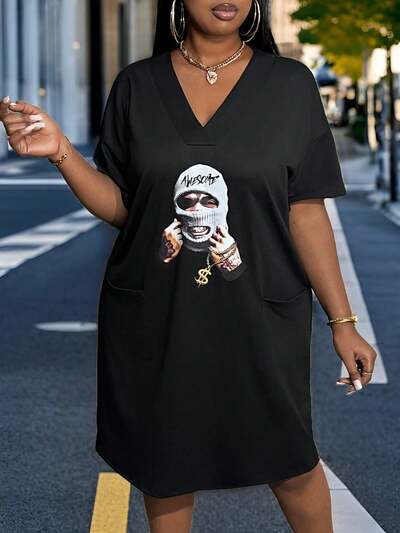 Plus Size Casual Loose Knitted Dress With Portrait Print, V-Neck, Summer Daily