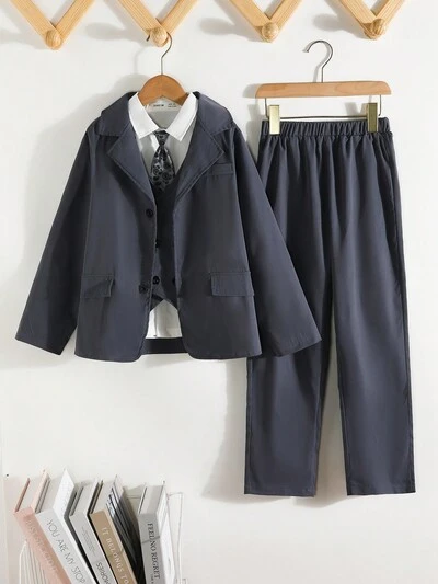 Tween Boy Solid Blazer & Suit Pants & Vest Blazer Without Shirt-60%