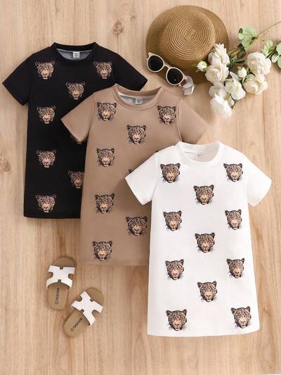 Young Girl Sweet & Lovely Short Sleeve Leopard Pattern Round Neck European & American Style Dress, Three Colors For Summer
