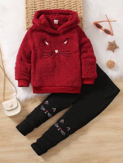Young Girl Cartoon Embroidery Teddy Hoodie & Leggings-46%