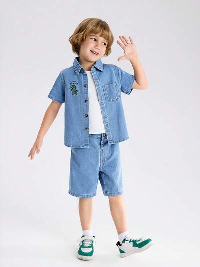 Young Boy Stylish Dinosaur Print Short Sleeve Shirt And Shorts Denim Set