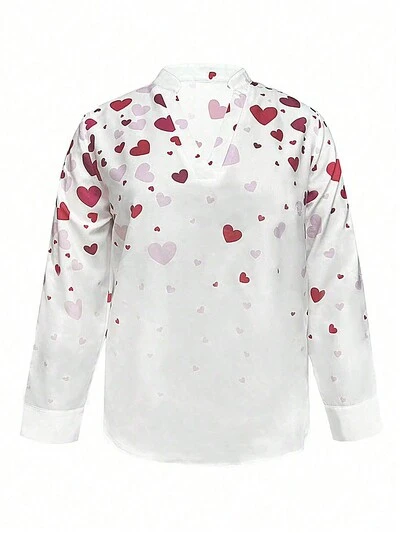 Plus Size Women's Heart Print Notched Collar Long Sleeve Shirt-65%