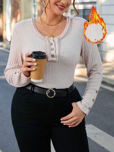 Women'S Plus Size Warm Thermal Knitted Striped T-Shirt For Winter Try On