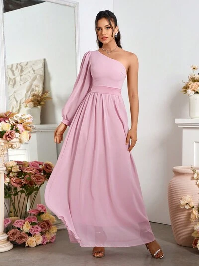 Women's Spring/Summer Solid Color Cape Sleeve Long Elegant Dress With Side Waist Knot Long Evening Dresses