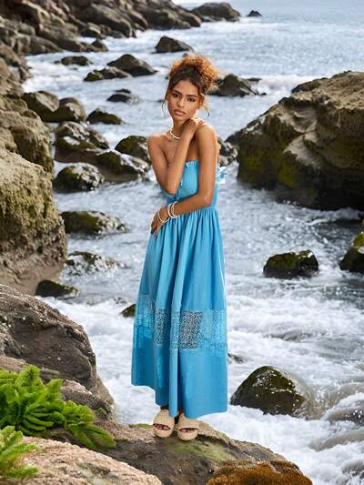 Women's Elegant Spaghetti Strap Contrast Lace Frill Trim Dress For Summer Vacation
