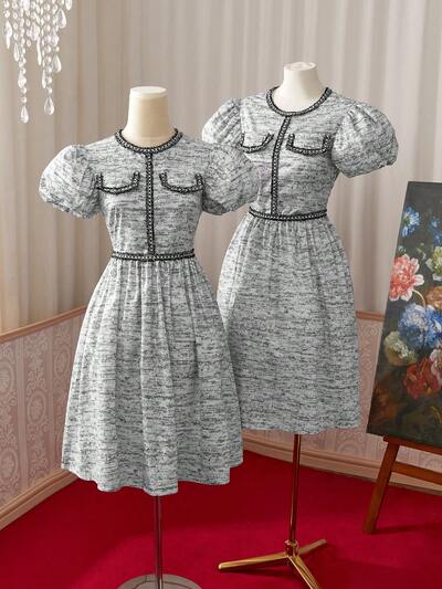 Women's Madeline Puff Sleeve Round Neck Two-Tone Summer Short Sleeve Dress