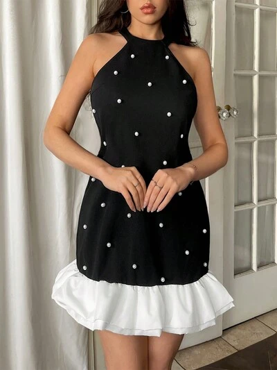 Women Black & White Colorblock Pearl Decor Crop Romantic Dress,Summer Dress,Romantic Party Dresses,Graduation Season Dresses,Suitable For Everyday, Party, Dating