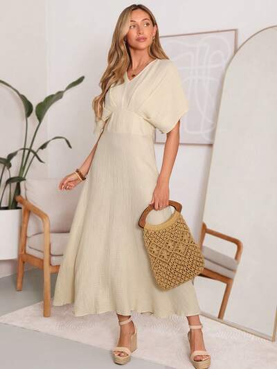 Spring And Summer Casual Texture Pleated A-Line Dress With Cinching Waist, Great For Holiday And Fashionable Look Women Dress-23%