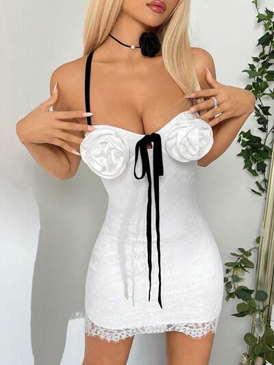 Y2k Slim-Fit 3d Flower Lace Floral Backless Dress With Jacquard Black & White Color-Blocking Design Graduation White Dress Kpop Style Going Out Dress Concert Outfits Summer Outfit Music Festival Festival Outfits