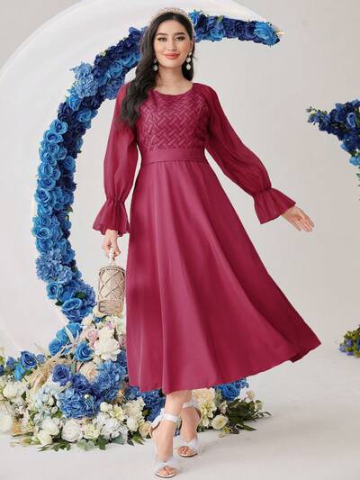 Burgundy Red Women's Fashionable Elegant Long Lantern Sleeves A-Line Dress