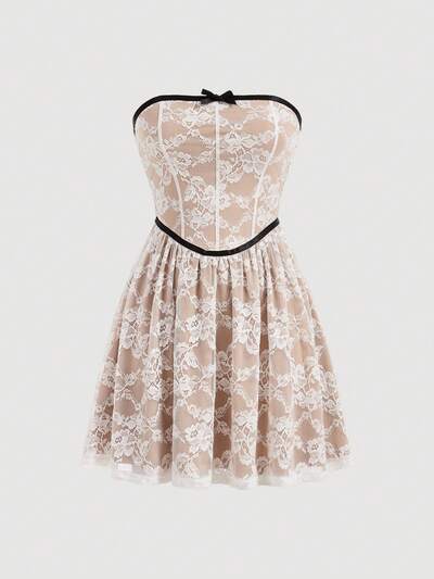 Women's Strapless Lace Bow Knot Contrast Color A-Line Dress With Jacquard Ribbon-23%