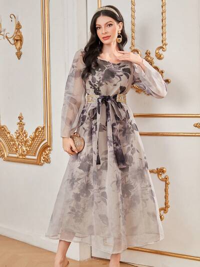 Floral Print Round Neck Gathered Waist Dress Long Evening Dresses Fall Cloth For Women