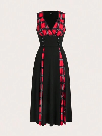 Black Patchwork Red Check Waist Waist Long Dress-23%
