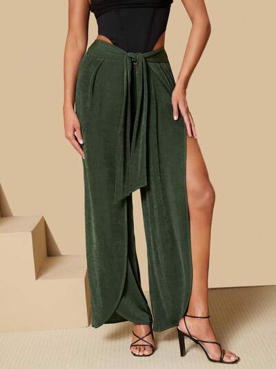 Solid Color Front Tie High Slit Wide Leg Pants-65%