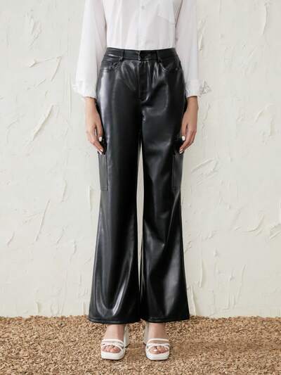 Flap Pocket Side PU Leather Wide Leg Pants Fall Cloth For Women-40%
