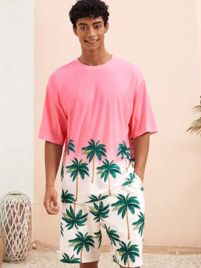 Men Summer Palm Tree Printed Short Sleeve Knit Casual T-Shirt And Shorts Set-23%
