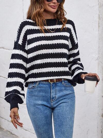 Striped Pattern Drop Shoulder Knit Pullover Fall Winter Sweater-60%