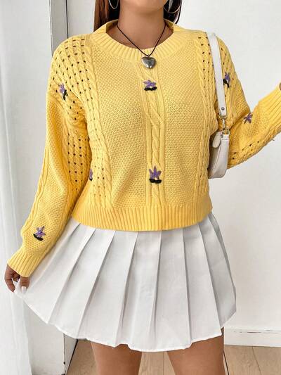 Plus Size Floral Embroidered Sweater Pullover Knit Pullover Fall Winter Sweater-60%