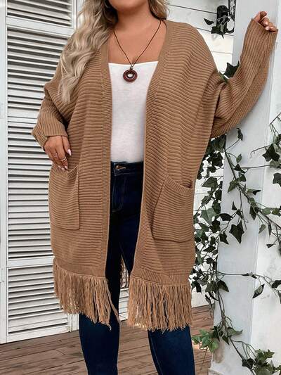 Plus Size Women's Drop Shoulder Fringe Hem Cardigan-60%
