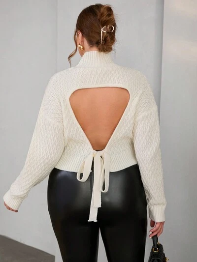 Plus Lace Up Backless Lantern Sleeve Sweater Knit Pullover Fall Winter Sweater-35%