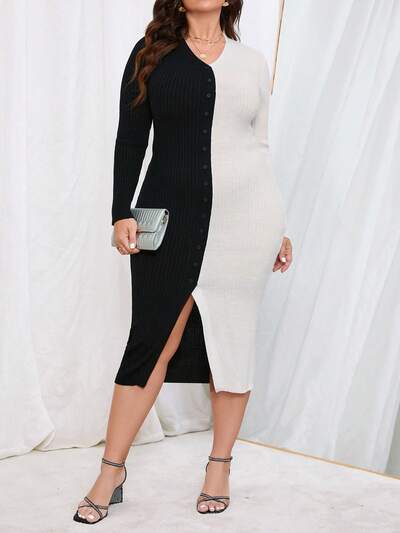 Plus Polo Neck Ribbed Knit Sweater Dress Fall Cloth For Women-60%