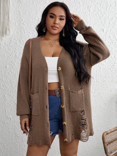 Plus Dual Pocket Distressed Drop Shoulder Cardigan-60%