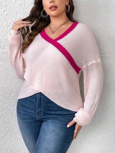 Plus Contrast Trim Drop Shoulder Crossover Sweater Knit Pullover Fall Winter Sweater-60%