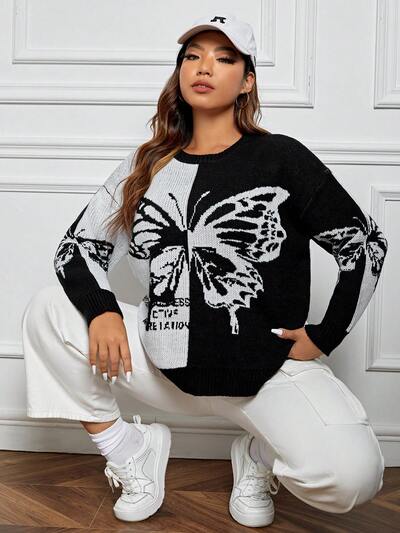 Plus Butterfly Pattern Drop Shoulder Sweater-60%