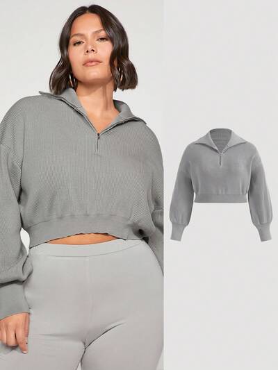 Plus Half Zip Drop Shoulder Crop Sweater-60%