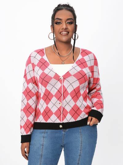 Plus Argyle Pattern Drop Shoulder Cardigan-60%