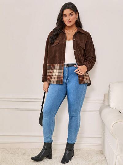 Plus Plaid Panel Drop Shoulder Corduroy Jacket-60%