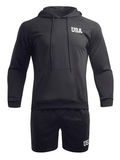 Men's Letter Print Raglan Sleeve Hoodie And Shorts Set, Athletic Suit, Tracksuit Gym Set Workout Set-50%