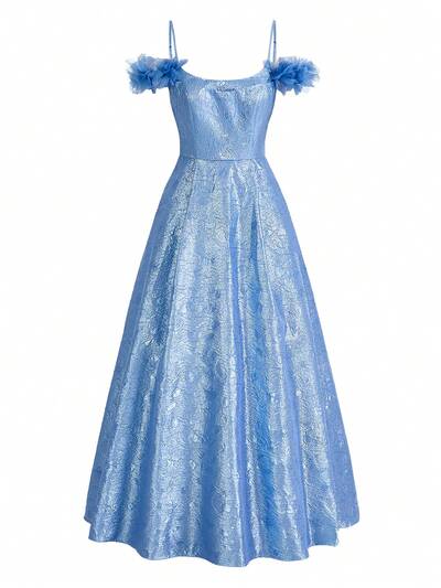 Elegant And Gorgeous Woman's Aqua Blue Woven Jacquard Glitter Fabric Spaghetti Straps Sleeve Loops Three-Dimensional Flower Decoration Front Chest Pleated High Waist Volume Umbrella Hem Spring Dress Party Prom Dinner Dress
