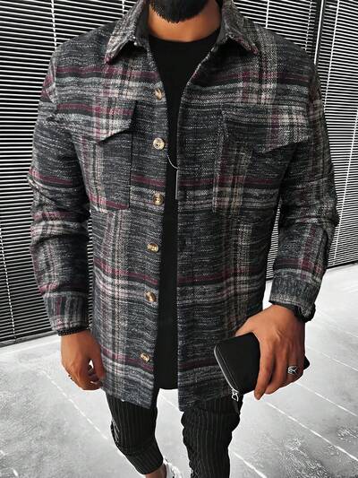 Men 1pc Houndstooth Print Flap Pocket Loose Jacket, For Fall Winter-65%