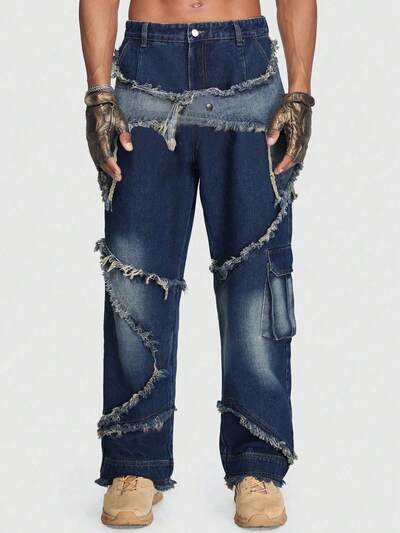 Men Raw Trim Flap Pocket Cargo Baggy Jeans-65%