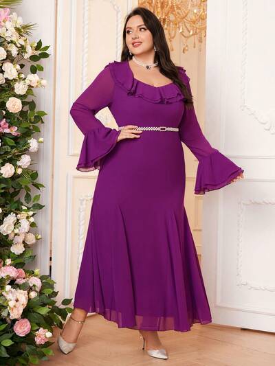 Plus Size Women's Arab Garment With Patchwork & Ruffle Trim Flare Sleeves Long Evening Dresses-60%