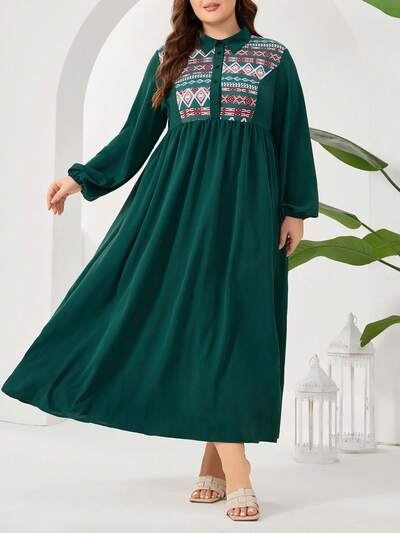 Plus Size Geometric Printed Lantern Sleeve Dress Kaftan Jalabiya Dress-16%