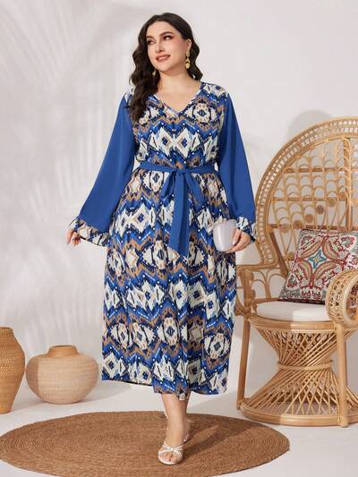 Plus Size Women's Arabic Style Printed Cinching Waist Dress-60%
