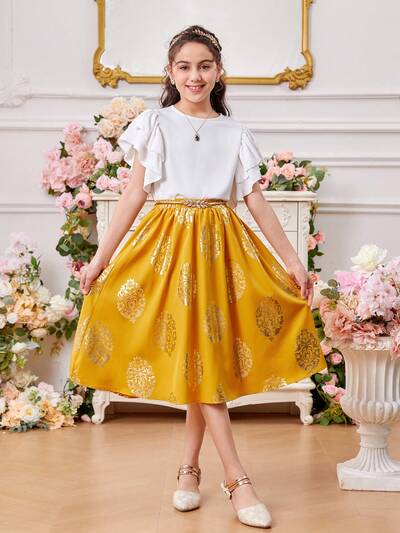 Tween Girl Round Neck Double Layer Ruffle Sleeve Top With Water Drop Shape At Back And Retro Patterned Skirt Set-60%