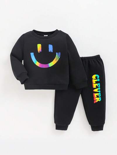 2pcs Unisex Baby Smiling Face Pattern Raglan Sweatshirt & Cuffed Pants Thickened Set-60%