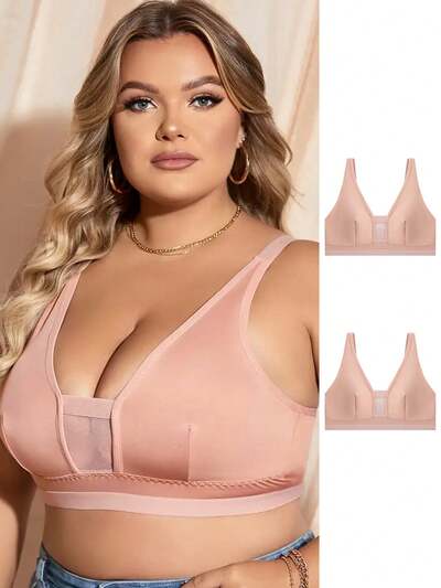 Plus Size Casual Apricot Mesh Insert Medium Stretch Bra-18%