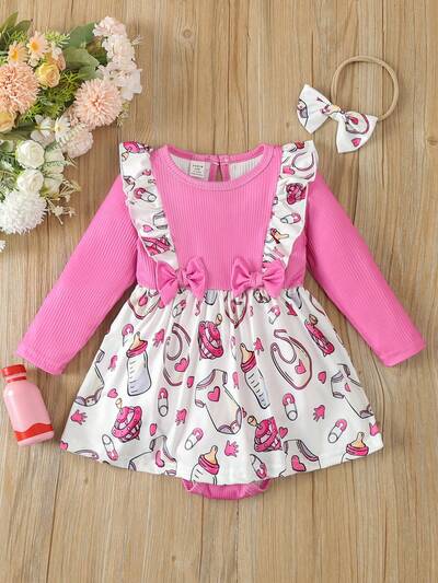 Infant Girls' Cartoon Print Mesh Splice Bodysuit Dress