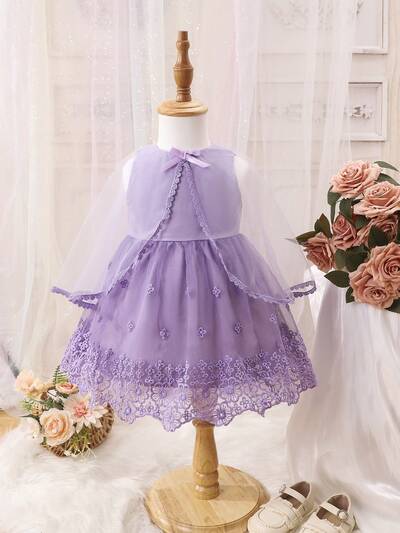 Baby Girl Bow Front Flounce Sleeve Jacket & Floral Embroidery Mesh Overlay Dress-60%