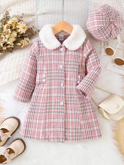 Baby Girl Plaid Print Borg Collar Coat & Hat-60%