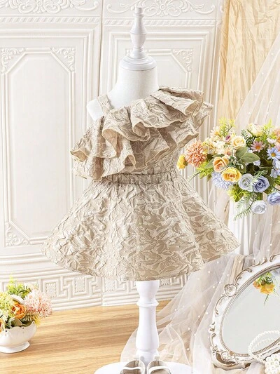 Baby Girl Gorgeous Elegant Textured Layered Ruffle Trim Top And Elastic Waist Skirt Set, Suitable For Summer-42%