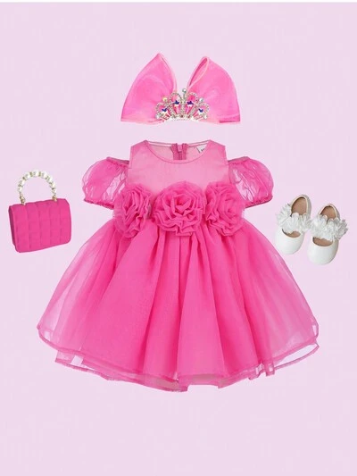Baby Girl Elegant Pink Satin & Organza Floral Applique Off-Shoulder Party Dress With Ruffled Neckline-42%