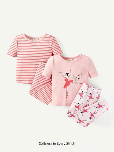 Baby Girl Snug Fit Character Stripe Print Short Sleeve Top And Long Pants Home Wear Set, 4pcs Matching Set-43%